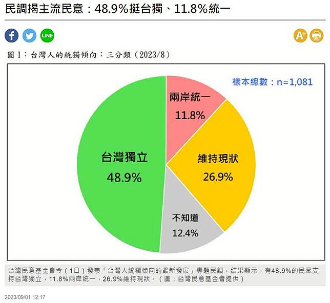 台灣民意基金會於 1 日釋出「台灣統獨傾向」的民調,指出有 48.9%的民眾支持台灣獨立。(圖/台灣民意基金會)