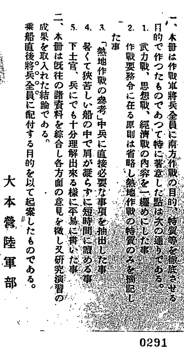一、本冊は作戦軍将兵全員に南方作戦の目的、特質等を徹底させる目的で作ったものであって、特に着意した点は次の通りである。
