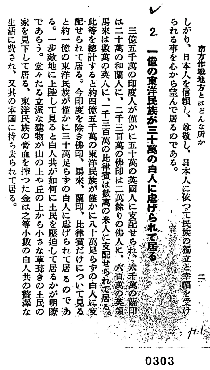 三億三千万の印度人がわずかに五十万の英国人に支配せられ、六千万の蘭印は二十万の和蘭人に、二千三百万の仏印は二万余りの仏人に、六百万の英領馬来は数万の英人に、一千三百万の比律賓は数万の米人に支配せられている。これらを総計すると、約四億五千万の東洋民族がわずかに八十万足らずの白人に支配せられて居る。今、印度を除き、仏印、馬来、蘭印、比律賓だけについて見ると、約一億の東洋民族が三十万足らずの白人に虐げられているのである。一歩敵地に上陸してみると、白人がいかに土民を圧迫しているかが明瞭であろう。堂々たる立派な建物が山の上や丘の上から小さな草葺きの土民の家を見下ろしている。東洋民族の膏血を搾った金はこれら少数の白人どもの贅沢な生活に費され、またその本国に持ち去られている。