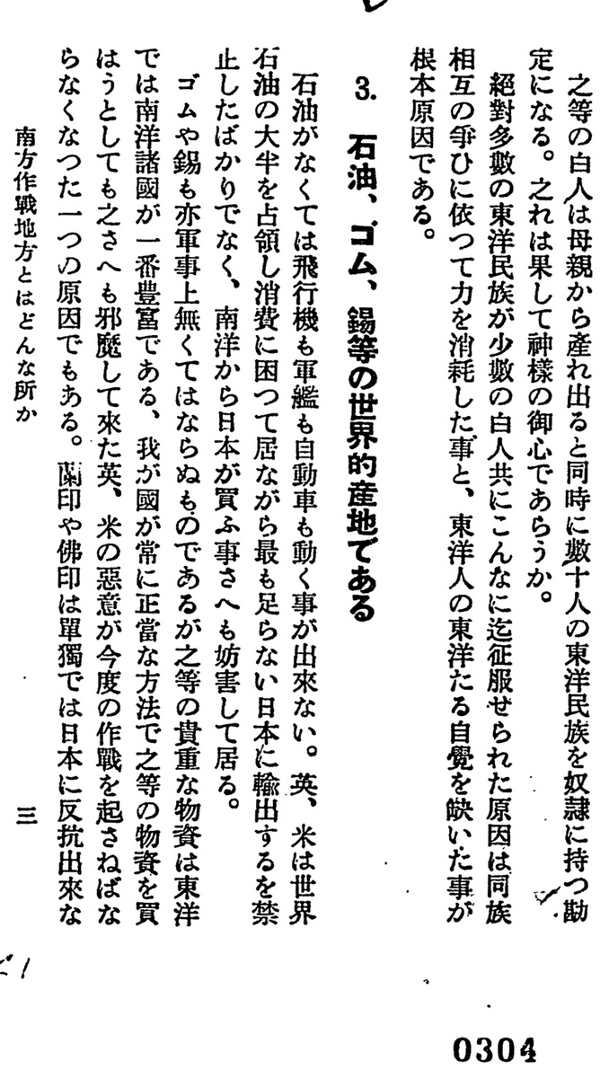 ゴムや錫もまた軍事上なくてはならぬものであるが、これらの貴重な物資は東洋では南洋諸島が一番豊富である。わが国が常に正常な方法でこれらの物資を買おうとしても、これさえも邪魔してきた英・米の悪意が、今度の作戦を起こさなければならなくなった一つの原因でもある。蘭印や仏印は単独では日本に反抗できないことは明瞭であるが、英・米の支援と脅迫で日本に敵意を示しているのである。石油と鉄の足りないことは日本の弱点であるが、ゴム、錫、タングステンの足りないのは米国の最大弱点であって、これらは大部分 南洋および南支から米国に供給されている。これを押さえたならば、日本は足りない石油や鉄を得ることができるのみでなく、米国の一番痛い所を突くことになる。米国が日本の南方進出を極端に厭い、かつ妨害してきた魂胆はここにも在るのである。