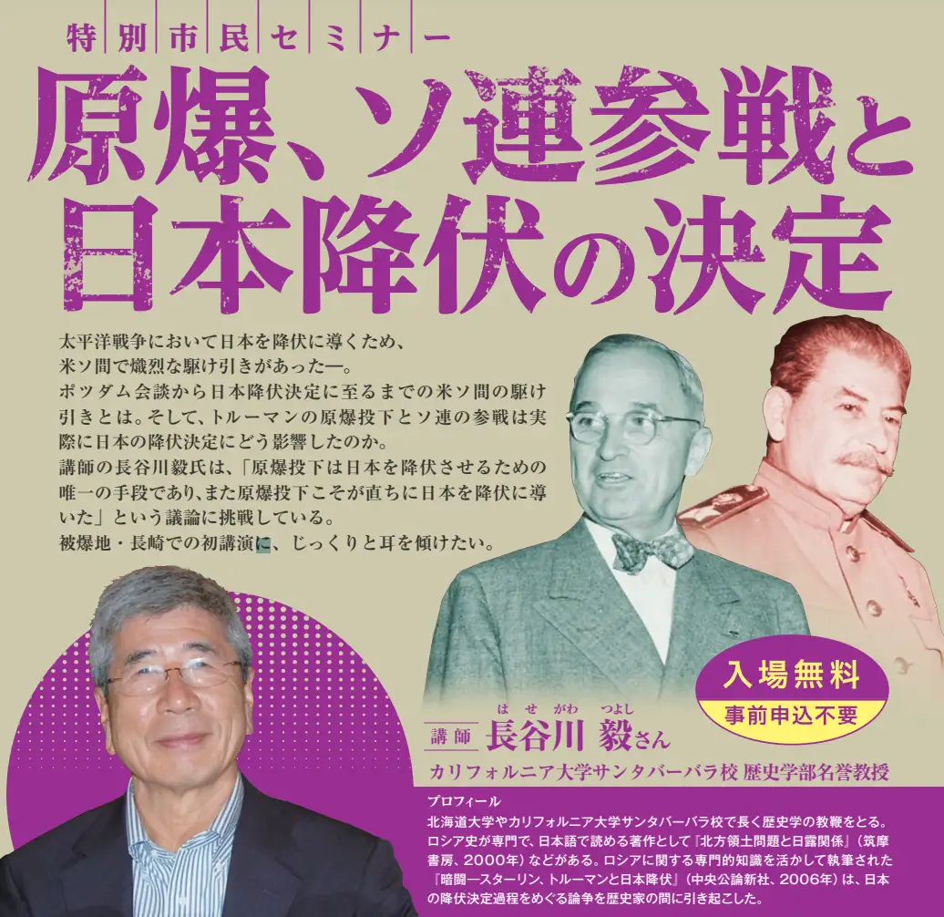 - 1945年8月14日颁布的『終戦の詔書』仅强调了原子弹的影响,没有提及苏联,从昭和天皇的发言来看,原子弹才是影响终战圣断的决定性因素。