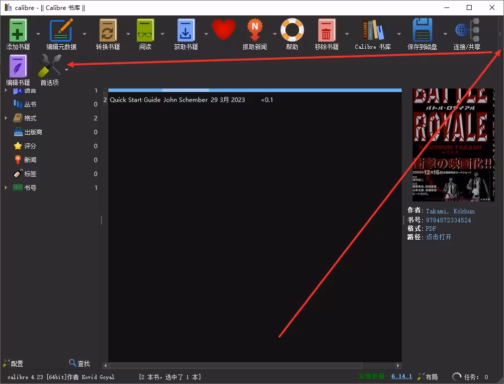 现在启动Calibre,点击顶部菜单最右侧的首选项按钮。有时候该按钮会被隐藏,这时您需要点击位于右上角的三个小点,然后选择偏好设置菜单。