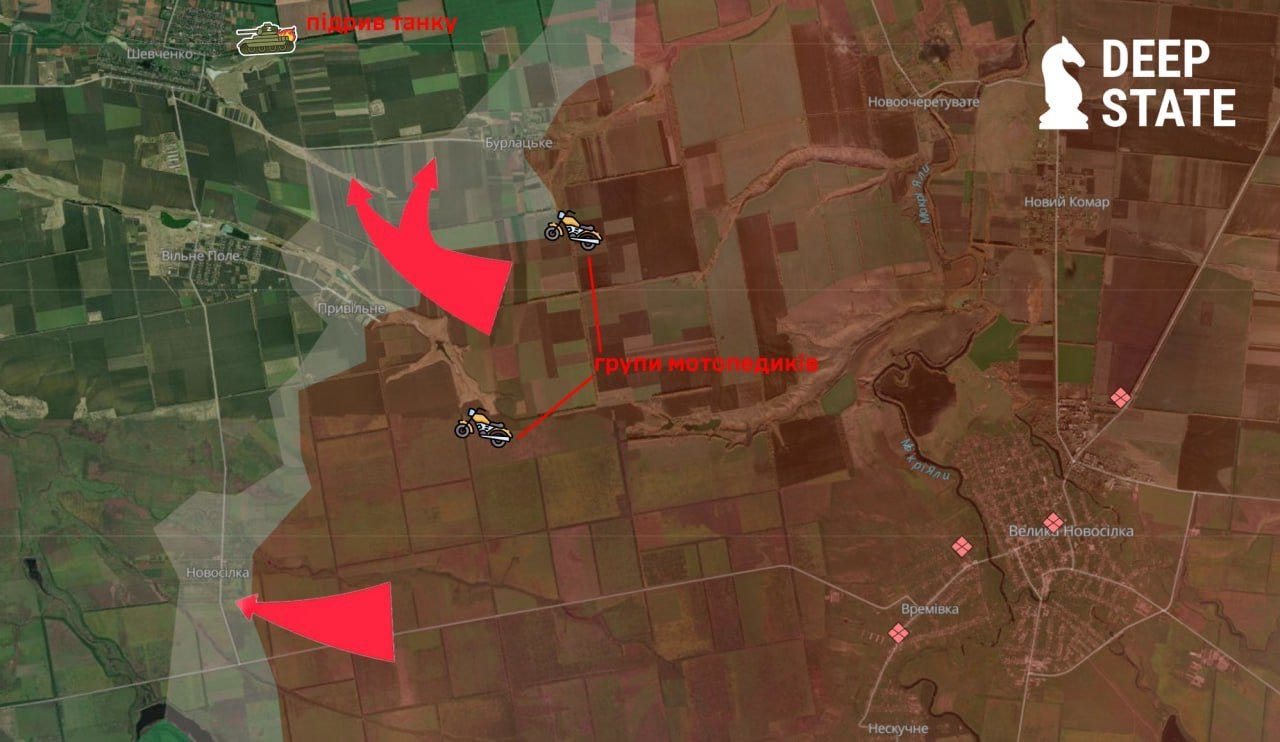 They assaulted towards Pryvil'ne and Novosilka with at least 20 armored vehicles and 41 motorcycles, including a motorcycle group used as a diversion.