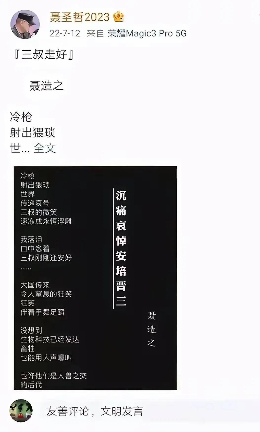 这首小诗唤作《沉痛悼念安倍晋三》,聂圣哲转发时还直接说“三叔走好”。悼念谁是他的自由,但为了一个日本人,他用这么恶毒的语言去攻击自己的同胞,真让人困惑。是什么让他的情绪如此失调?