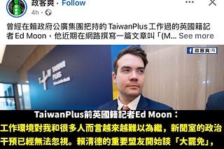 Ed 在個人Substack撰文揭露,他在 TaiwanPlus 工作四年間,新聞室內部屢遭政治干預。導火線之一,是一則形容美國總統川普為「被定罪的重罪犯」的新聞遭撤下。此後,他認為新聞專業難以維持,並逐漸感受到公共言論環境的轉變。