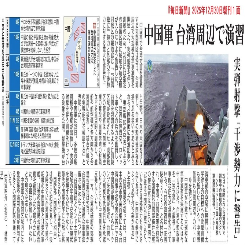 2. 2025年12月30日《每日新聞》早版頭條新聞之後刊登了題為“中國軍隊在台灣附近進行演習,發射實彈:‘警告干涉勢力’”的新聞。