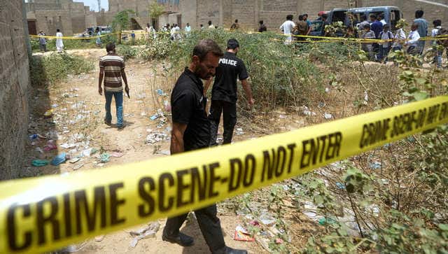 巴基斯坦調查人員在卡拉奇警戒線外檢查巴基斯坦防空系統擊落疑似印度無人機的現場。美聯社